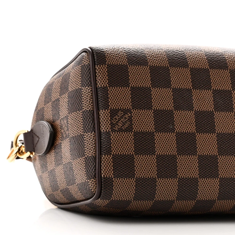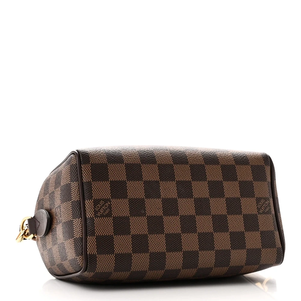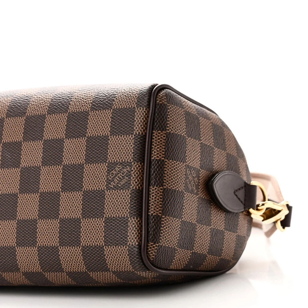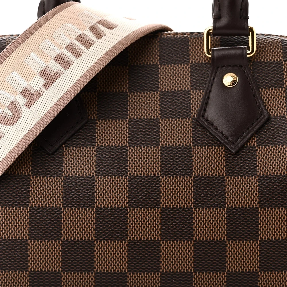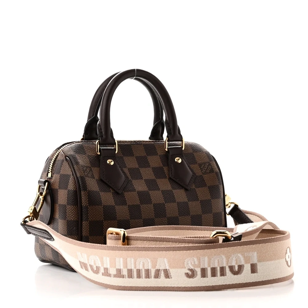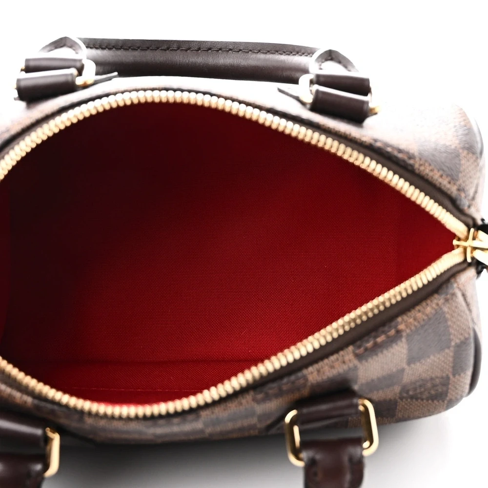 This Louis Vuitton Damier Ebene Speedy Bandouliere 20 is a timeless bag in brown checkered canvas. The cowhide leather handles and brass hardware add elegance, while the red fabric interior provides vibrant contrast and functionality.