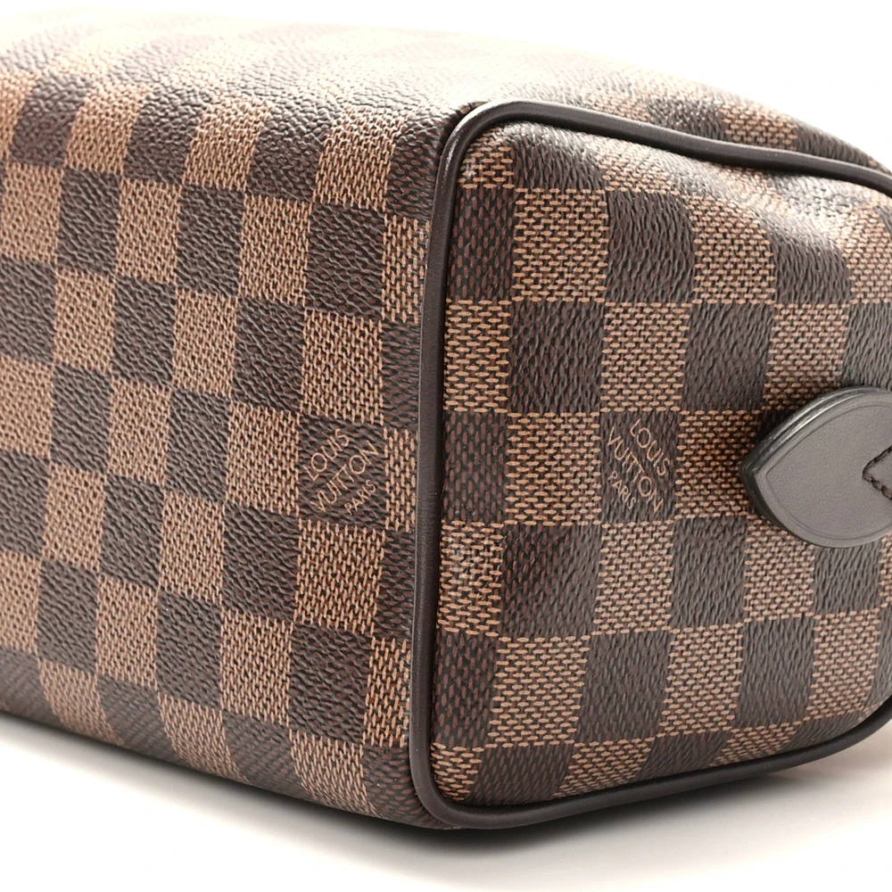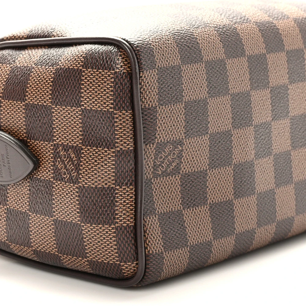This Louis Vuitton Damier Ebene Speedy Bandouliere 20 is a modern, compact version of a Louis Vuitton icon, rendered in the brand’s signature damier check canvas. Detailed with brown vachetta cowhide leather top handles and polished brass hardware, this bag opens to a rich red fabric interior with a practical patch pocket. The combination of its iconic design, warm tones, and compact size makes it a sophisticated yet versatile piece for the stylish individual.
