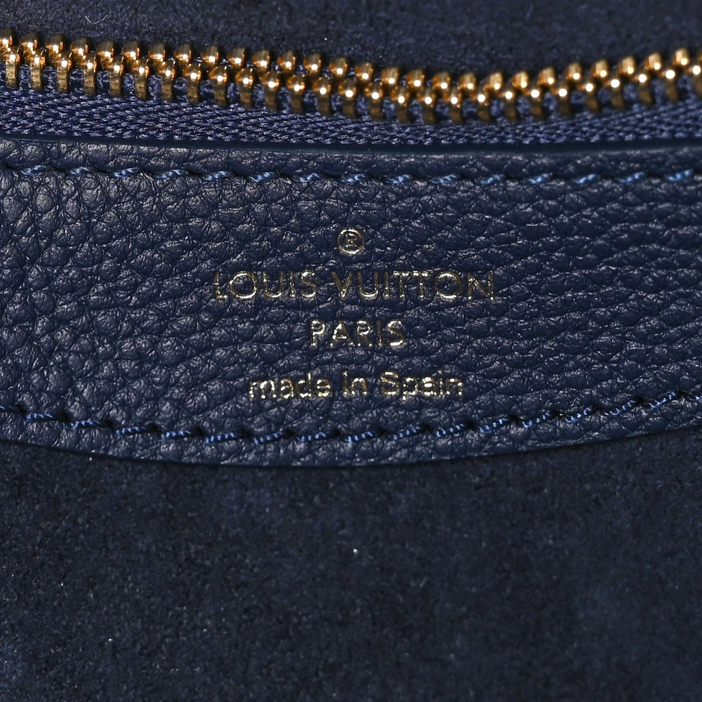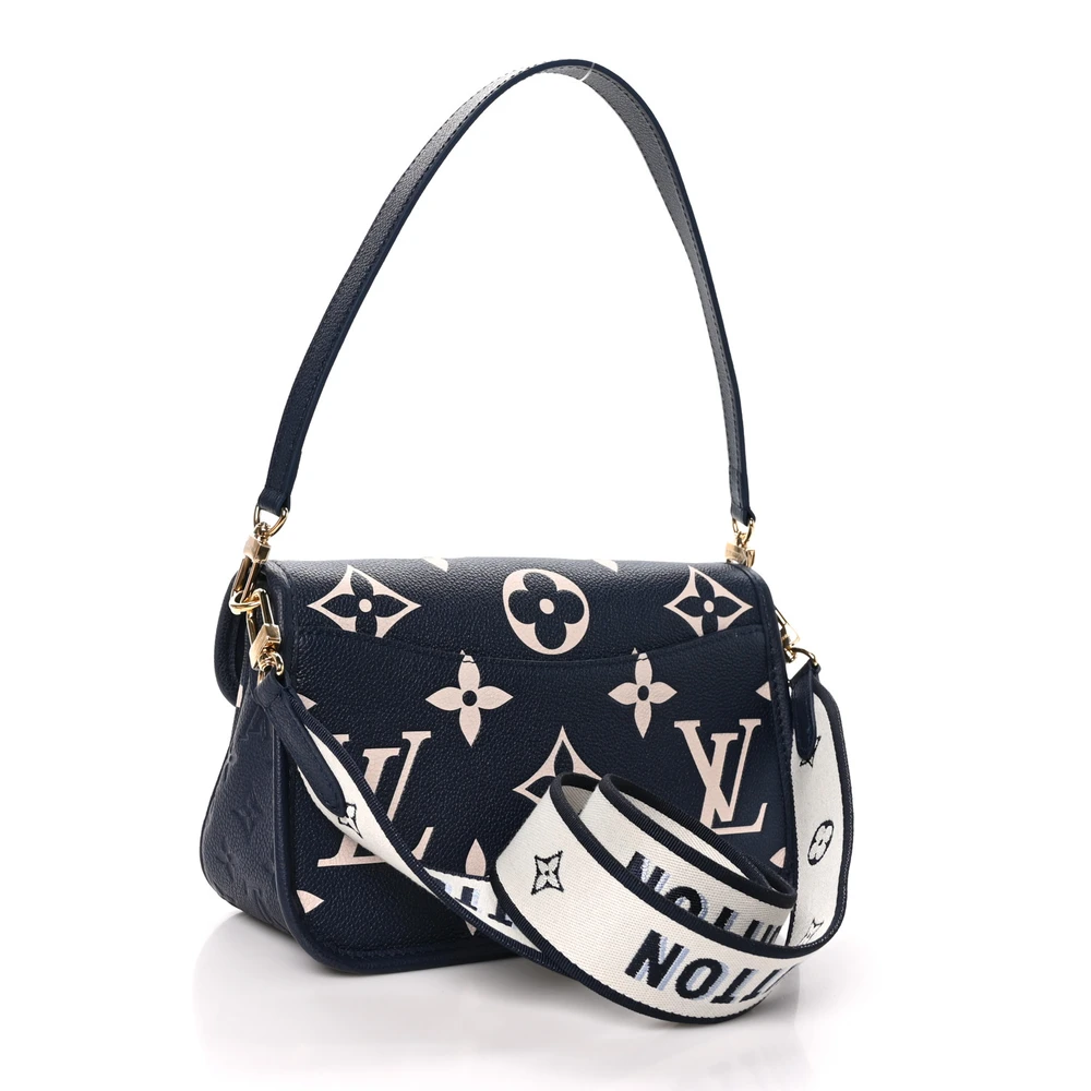 This Louis Vuitton Empreinte Giant Monogram Diane in Navy and Creme is crafted of oversized monogram print on calfskin leather in blue and white. The bag features a leather strap handle, optional canvas shoulder strap, and polished gold-tone hardware, with the front flap opening to a dark blue microfiber interior with a zipper pocket.