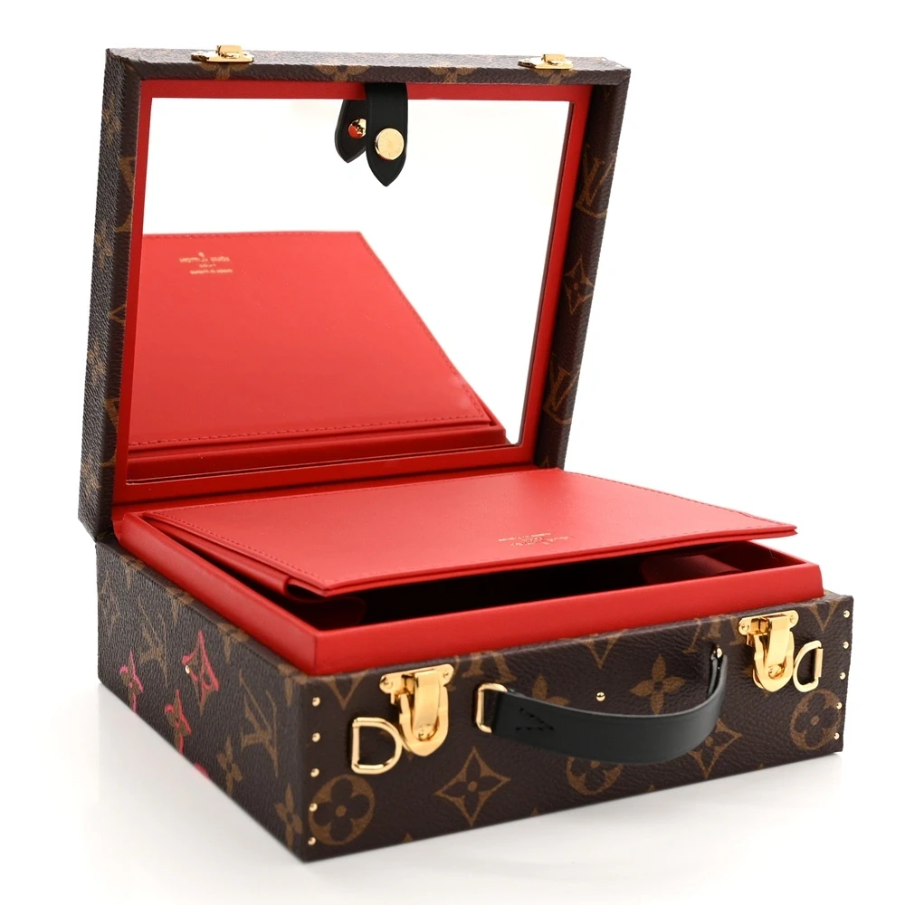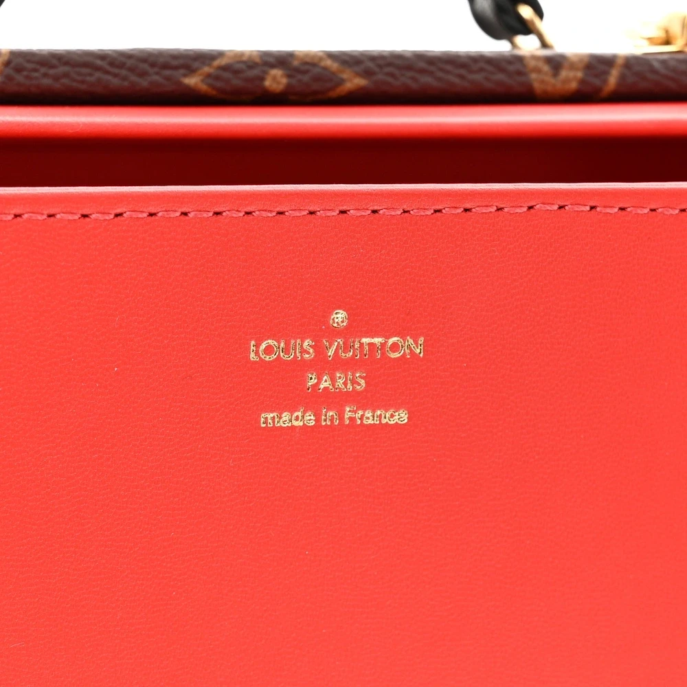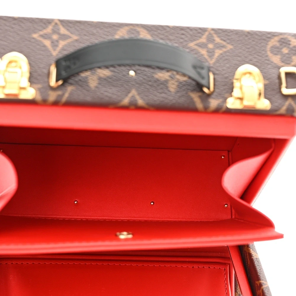 This Louis Vuitton stylish trunk bag is crafted of Louis Vuitton monogram on toile canvas. The shoulder bag features a black leather handle, an optional shoulder strap, and polished gold-studded hardware at the joints with polished gold buckles. This opens to a partitioned red leather interior with a large mirror.