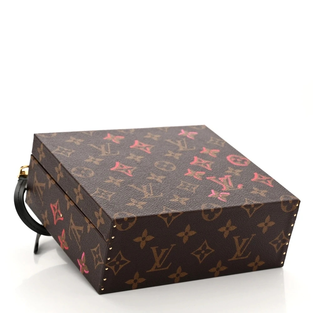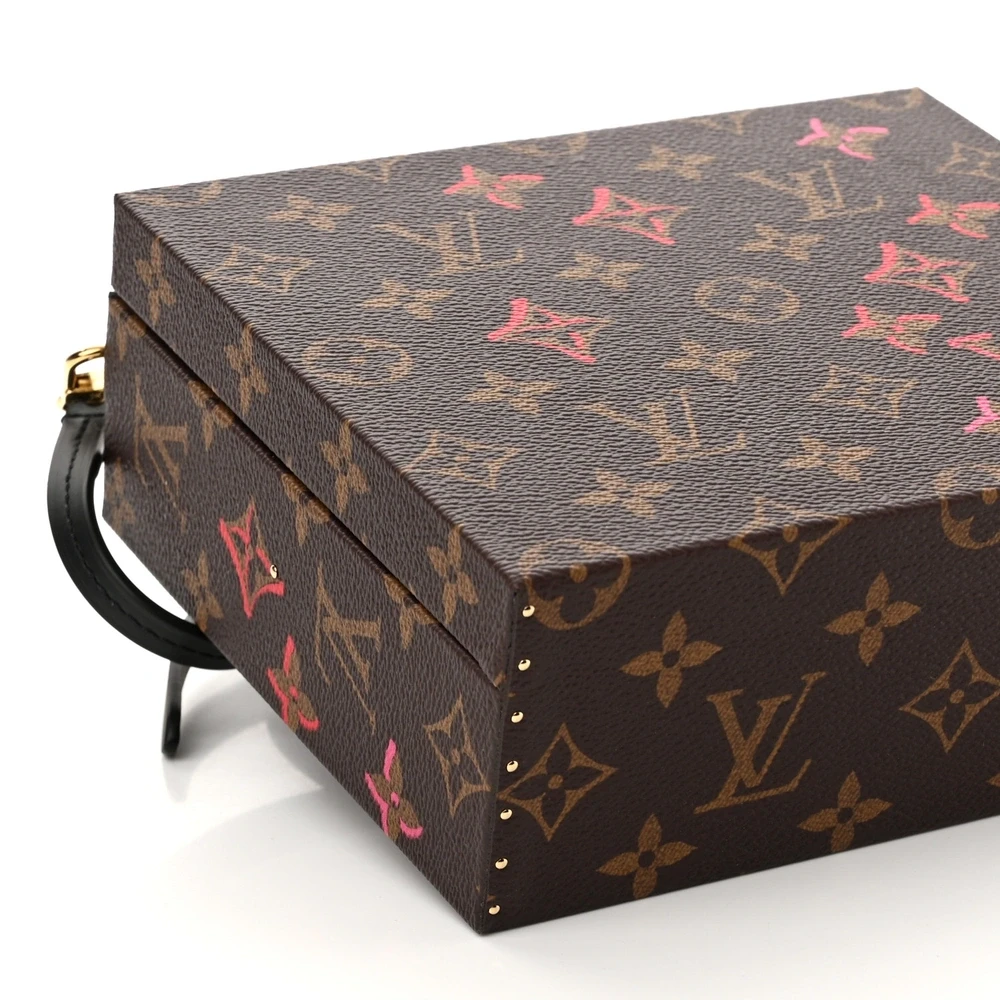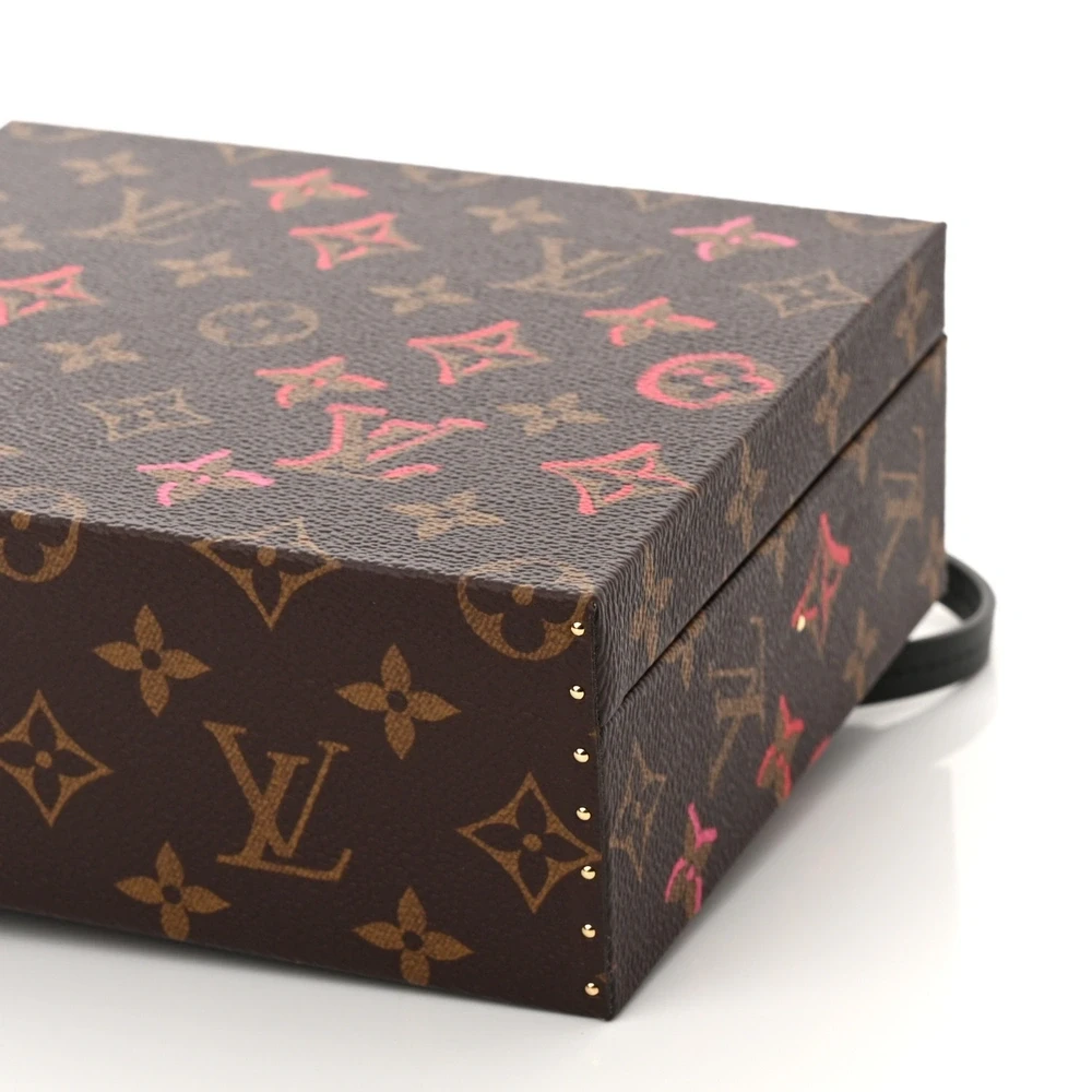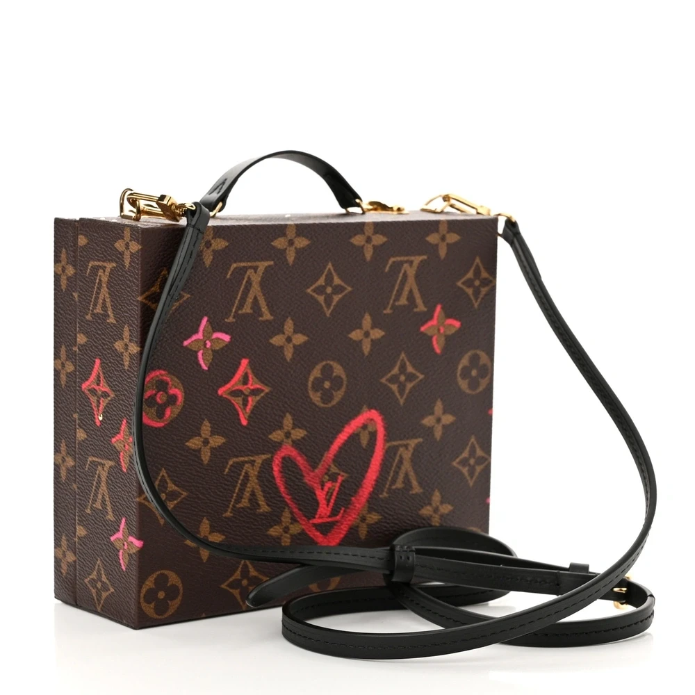 This Louis Vuitton stylish trunk bag is crafted of Louis Vuitton monogram on toile canvas. The shoulder bag features a black leather handle, an optional shoulder strap, and polished gold-studded hardware at the joints with polished gold buckles. This opens to a partitioned red leather interior with a large mirror.