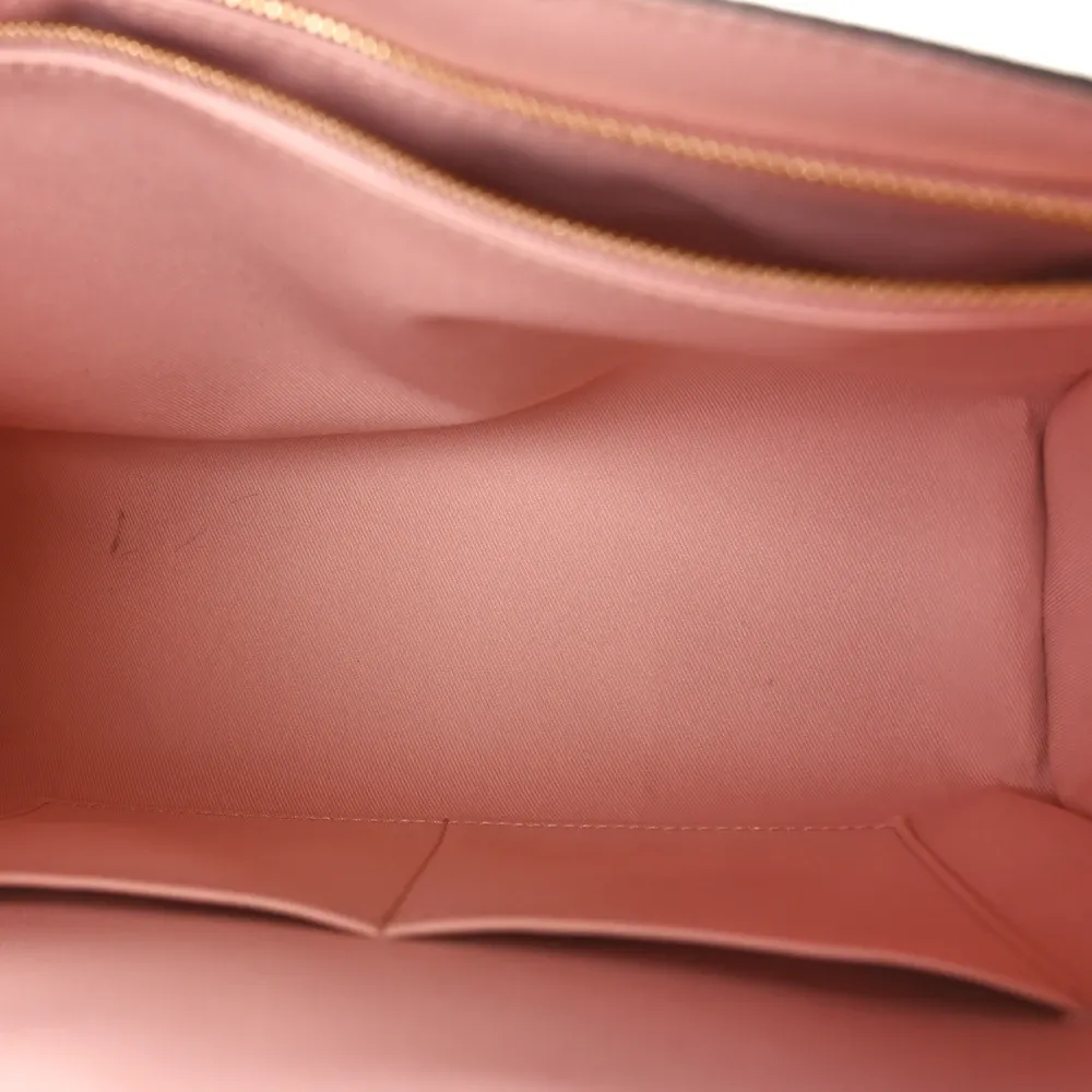 This Louis Vuitton Damier Ebene Bond Street in Magnolia features pink accents that soften the classic Damier canvas. It includes a pink and brown handle, an optional strap, and opens to a pink fabric interior with zipper and patch pockets. This Bond Street bag offers a feminine touch to the traditional LV design, making it a standout accessory for any occasion.