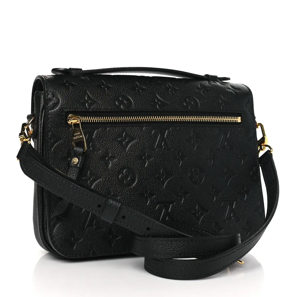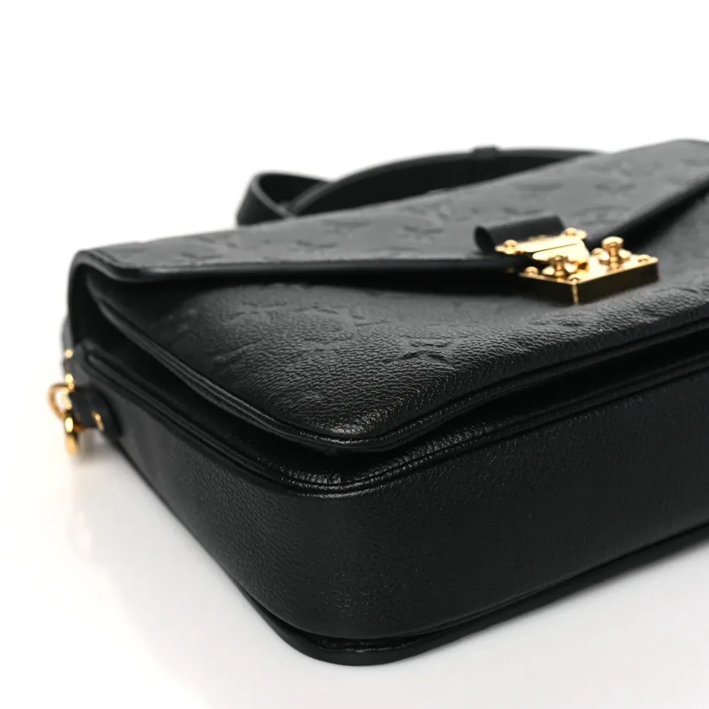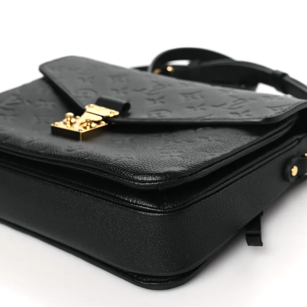 This Louis Vuitton Black Empreinte Leather Pochette Metis PM Brass Hardware combines luxury and functionality. Crafted from black monogram Empreinte leather, it boasts a top handle, an adjustable shoulder strap, and polished brass hardware. The flap opens to reveal a partitioned gray striped fabric interior, making this bag as practical as it is stylish.