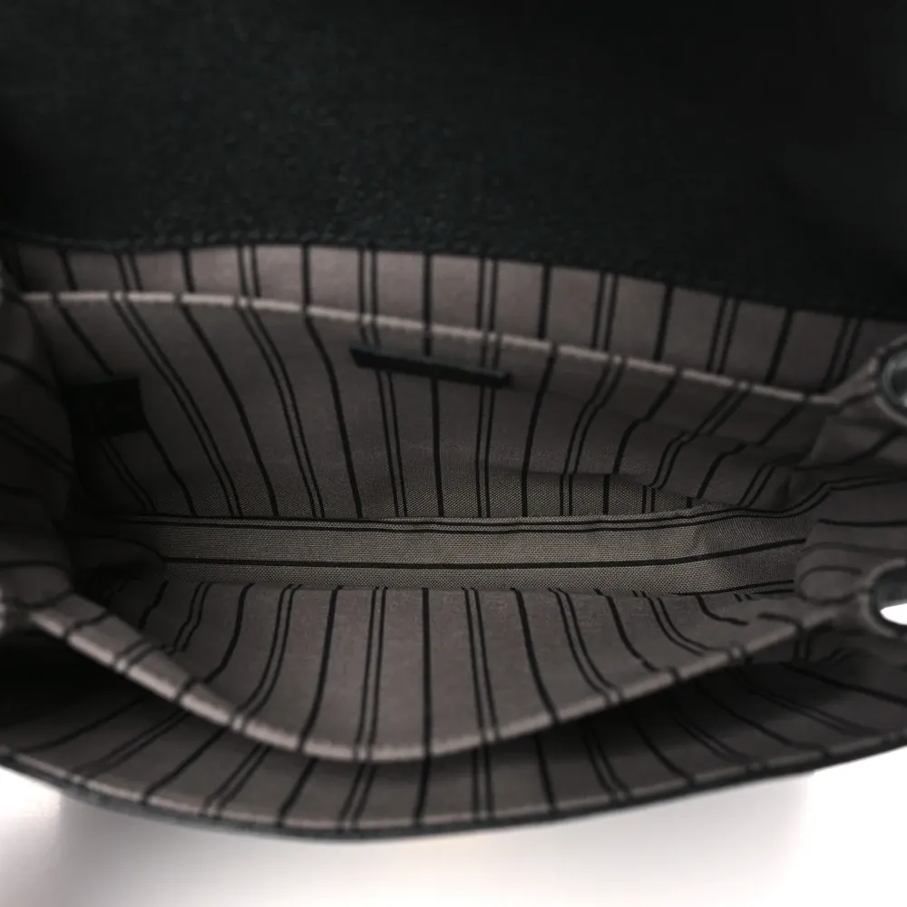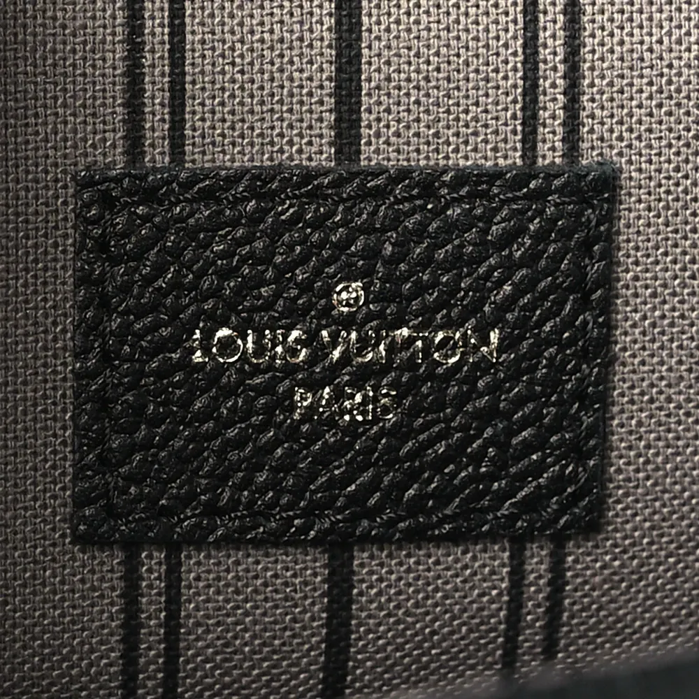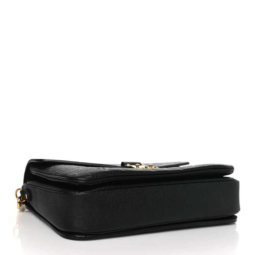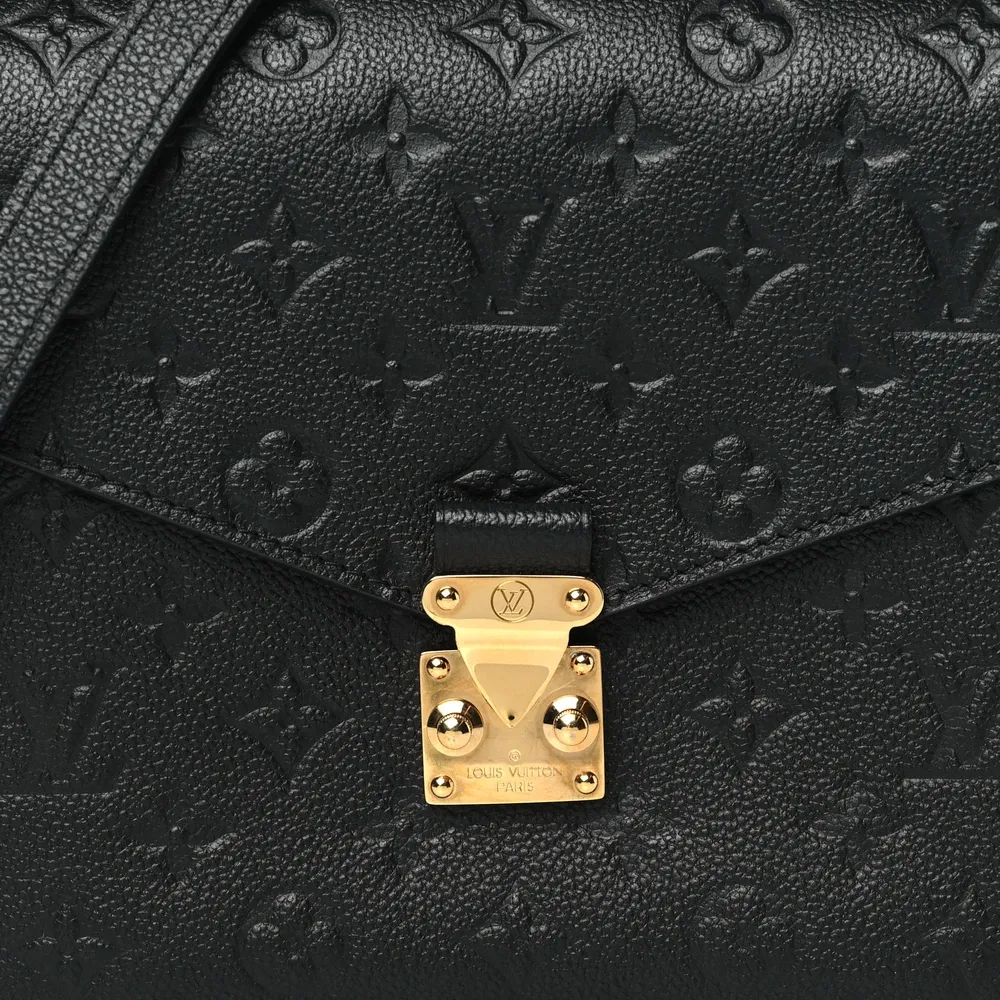 This Louis Vuitton Black Empreinte Leather Pochette Metis PM Brass Hardware combines luxury and functionality. Crafted from black monogram Empreinte leather, it boasts a top handle, an adjustable shoulder strap, and polished brass hardware. The flap opens to reveal a partitioned gray striped fabric interior, making this bag as practical as it is stylish.